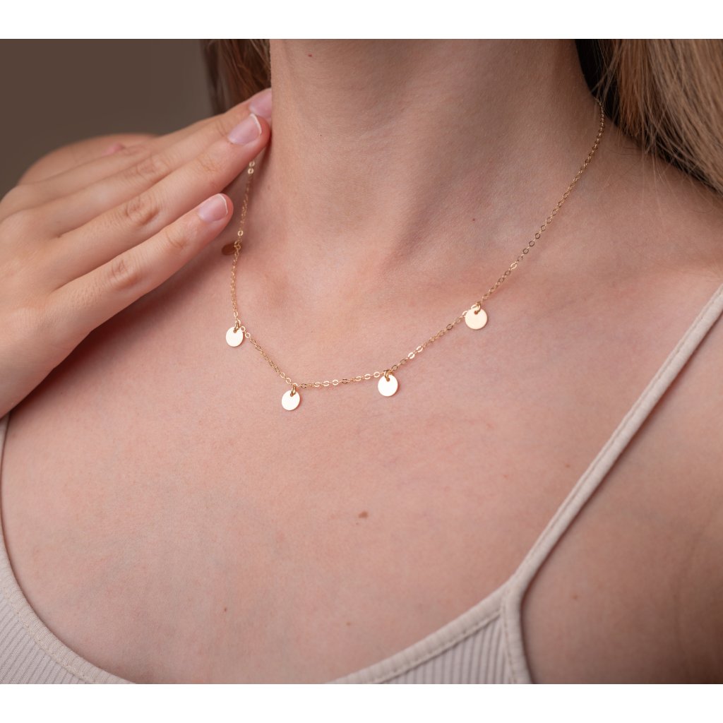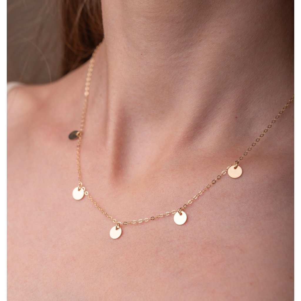 Tento náhrdelník zaujme svým minimalistickým designem a jemnými zlatými placičkami, které se při pohybu elegantně třpytí. Placičky jsou pečlivě rozmístěny na tenkém řetízku, což vytváří harmonický a nadčasový vzhled, který je skvělý jak pro každodenní nošení, tak pro speciální příležitosti.