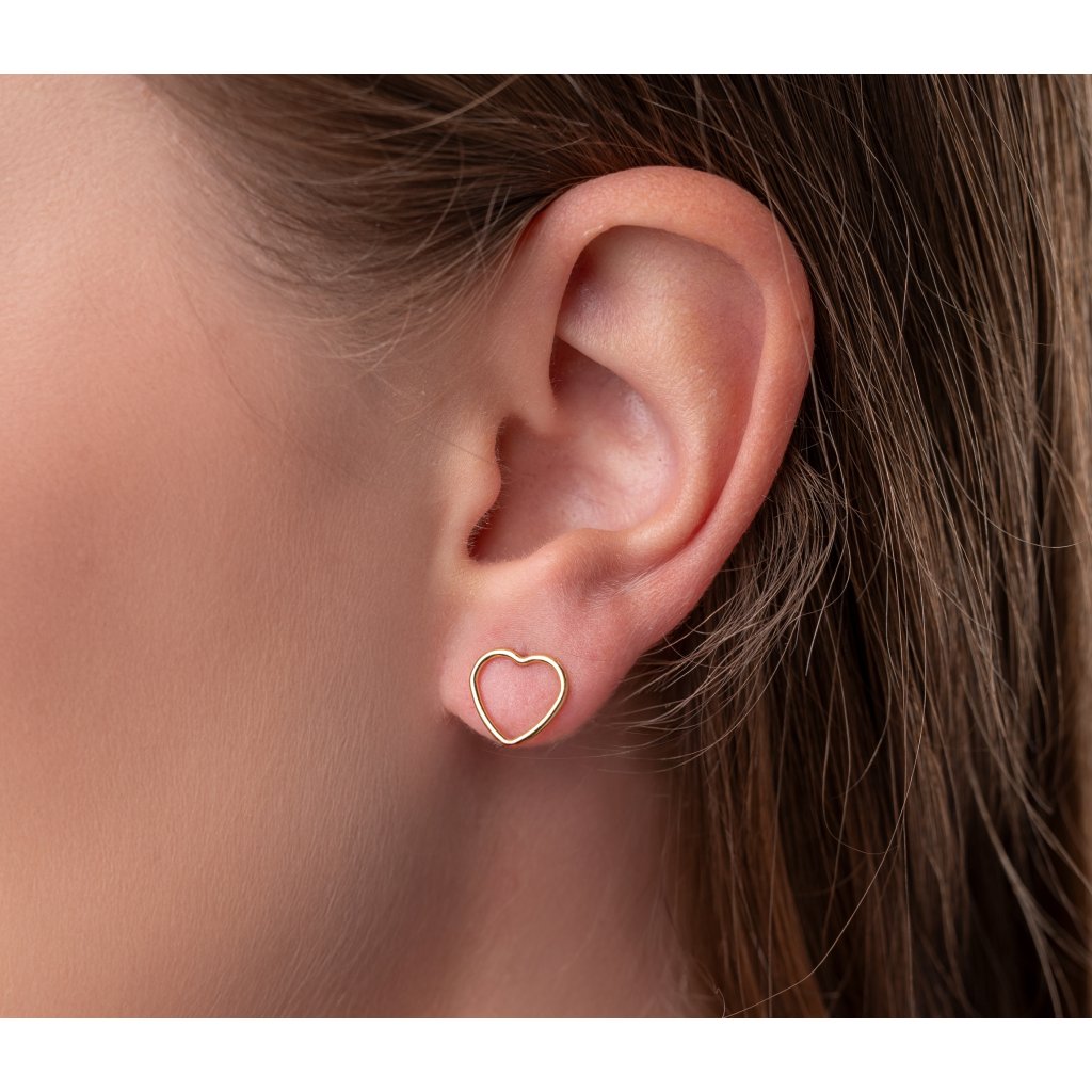 Jemné náušnice ve tvaru srdce okouzlí svou minimalistickou siluetou a elegantním zlatým leskem. Otevřený design působí vzdušně a lehce, díky čemuž se skvěle hodí pro každodenní nošení i jako něžný doplněk na výjimečné příležitosti.