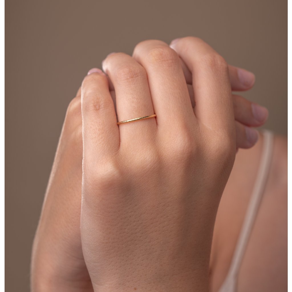 Tenký prstýnek zaujme na první pohled svým precizně broušeným povrchem, který krásně zachycuje světlo a dodává šperku jemný třpyt. Díky čistému a minimalistickému designu je ideální pro každodenní nošení i slavnostní příležitosti.